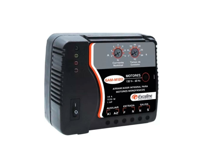 Arrancador integral para motores monofásicos. Relé (relevador) monofásico diseñado especialmente para arrancar y proteger motores eléctricos, contra daños ocasionados por fallas comunes de corriente y voltaje. Realiza las funciones de contactor, interruptor, térmico y protector de voltaje. Salida de potenciapara conexión directa del motor.