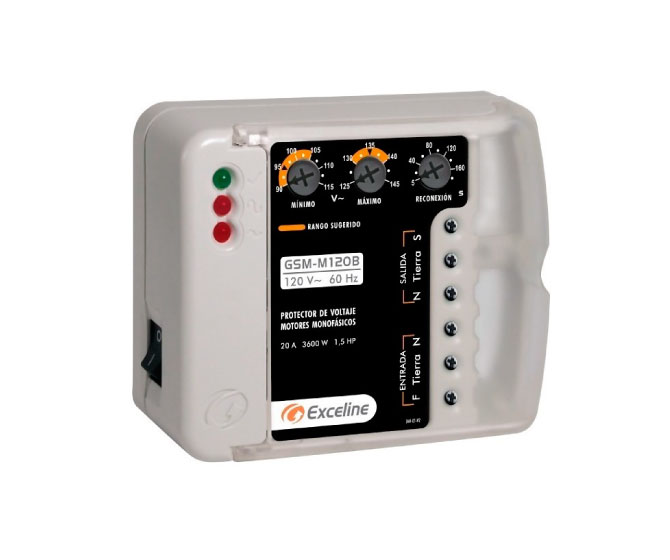 Protector contra alto y bajo para motores monofásicos hasta 1,5 HP. Posee ajuste de voltaje mínimo y máximo, ajuste de ciclo de espera entre 5 y 180 segundos, acceso para canaletas, cubierta protectora con cierre de seguridad y dos formas de montaje: sobre superficie plana o en cajetín 2″x4″ .